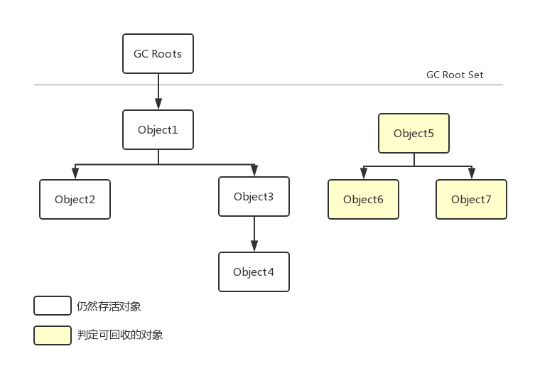 算法思路:以GC Roots 对象为起始点,从这些节点开始向下搜索(深度搜索),搜索所走过的路劲成为引用链(Reference Chain),当一个对象到GCRoots不存在引用链(不可达)时,则证明此对象是不可用,即判定为可回收对象。逻辑图如下: